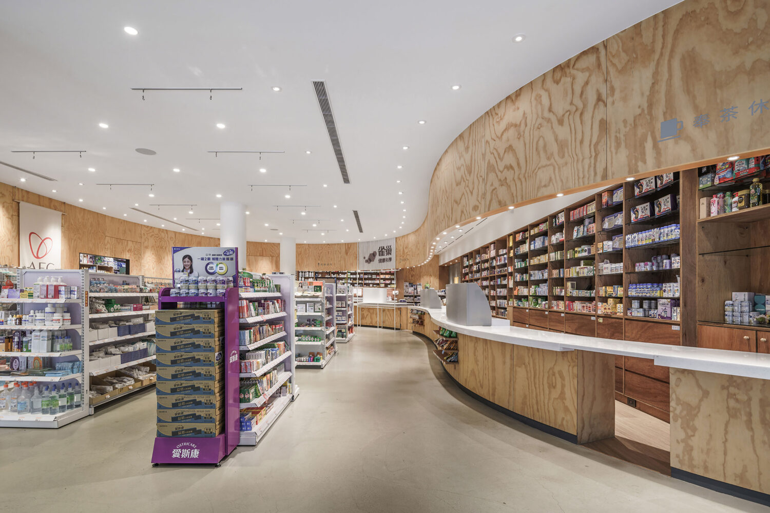 為呼應整體設計,店內不使用冰冷白瓷磚做為主色,而與外牆一樣使用木作材質作為整體設計,同樣也捨去刺眼的白日光燈,而大量採用接近太陽色的暖光LED燈,讓藥局整體氛圍更加溫暖親近,就連生硬的銳利的牆面切角,也換成流線型設計,不只是為了防止碰撞受傷,也讓整體看起來更舒適友善。